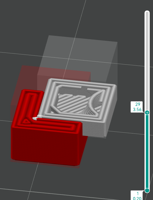 Another thing to notice about the above screenshot: the regions printed in different colors, each have their own perimeters even where they are touching in the interior. So there’s extra material used in the bordering region between colors, compared to printing the entire object in one color. I’m not sure whether the reasons for this have more to do with the physical realities of making a successful print, or whether the slicer software is just not up to the task of doing something better where the colors touch. For the moment, just be aware of it and maybe think about writing your code to minimize the complexity of this internal border to save on material.
