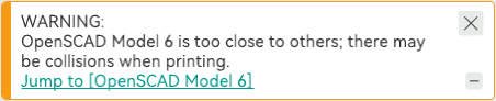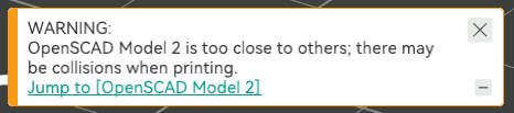 I disassembled these parts into separate objects, making the mcubes0 container go away. Two things happened. “Model 2” dropped to the print plate, because objects have to sit on the plate to be printed. And I got this warning: