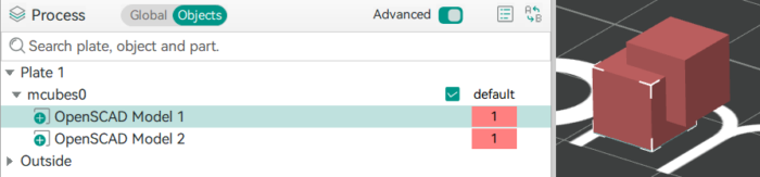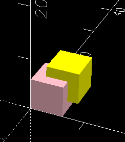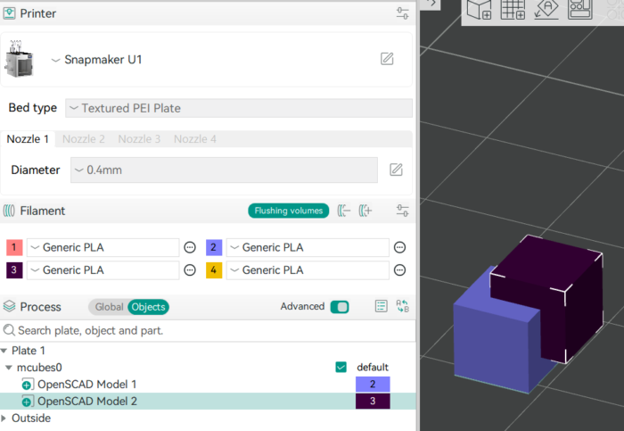 Let’s go step by step through the process of creating, exporting, and slicing a simple multi-colored model of a couple of overlapping cubes. Remember, this requires the “lazy-unions” option being enabled.