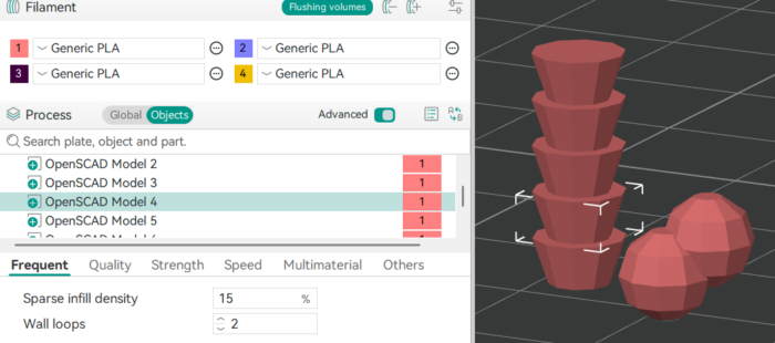 I now select filaments to print this model. As it happens, I’m using different colors than the ones I encoded in OpenSCAD.