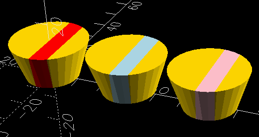 This has implications when you modularize. No longer can you write a module that returns a multi-colored object, then scale, orient, and position whatever that module retutns. You have to structure your code in a way that makes it possible to return just the red part of an object (let’s say), and position it, then make another call that returns just the yellow part, and duplication that positioning so the two parts end up in their proper relative positions.