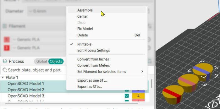 Of course, one can’t just trust that this will work – I did a test import into Orca slicer. The following screenshot shows the import after I’ve selected colors for the different parts.