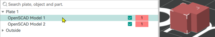 The outline shows plate 1 contains an object called mcubes0 (the name of the imported 3MF file), containing two parts, OpenSCAD Model 1 and OpenSCAD Model 2. Model 1 is selected in the screenshot, with selection handles in the preview panel showing the corresponding shape. You’ll notice the colors in the model didn’t survive the export process. That’s expected. The important thing is that the division into separate objects is retained. We’ll select their colors next.