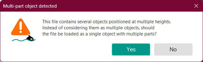 The message beginning with “This file contains several objects…” shows we were successful in creating a multi-object 3MF, and we should answer Yes, we do want a single object with multiple parts.